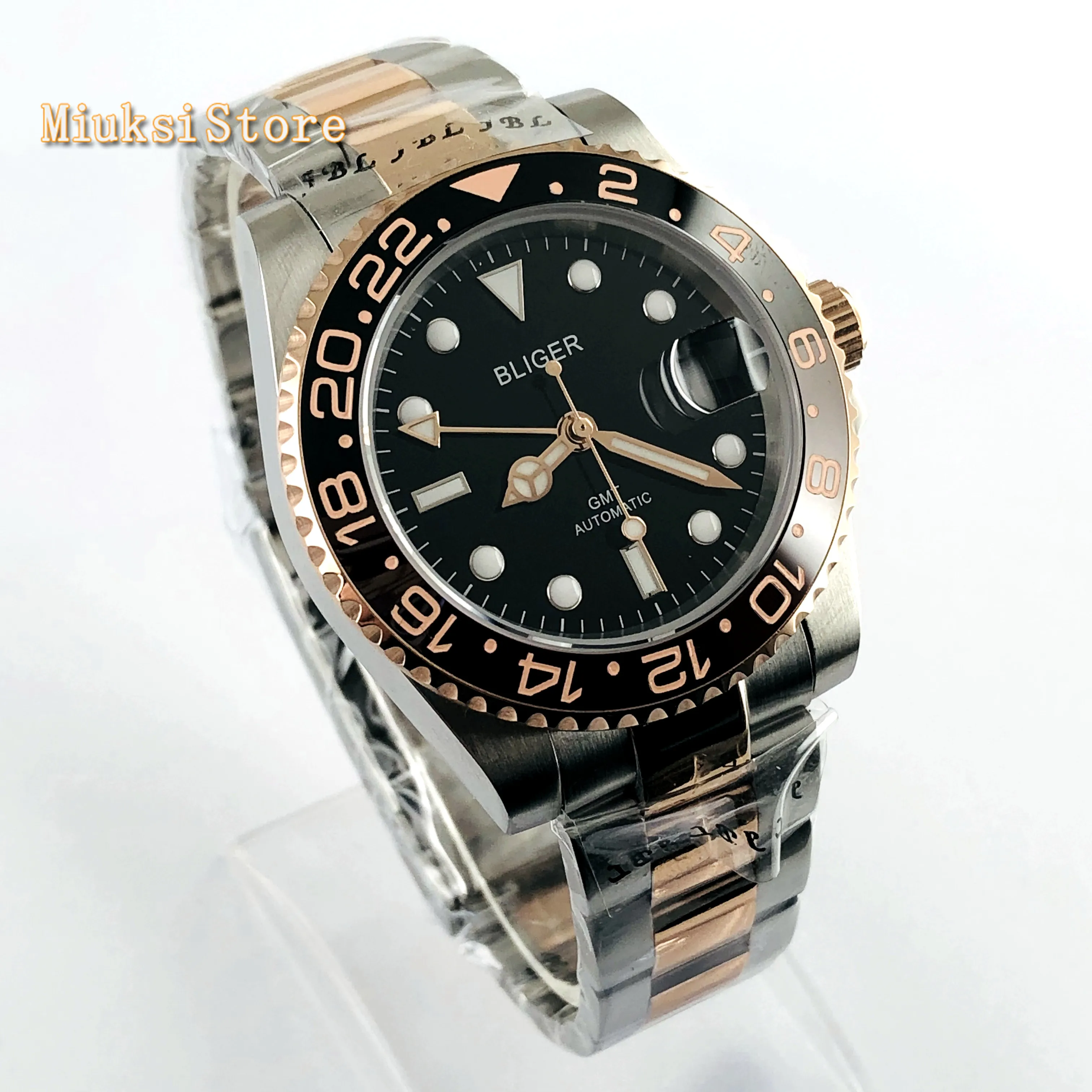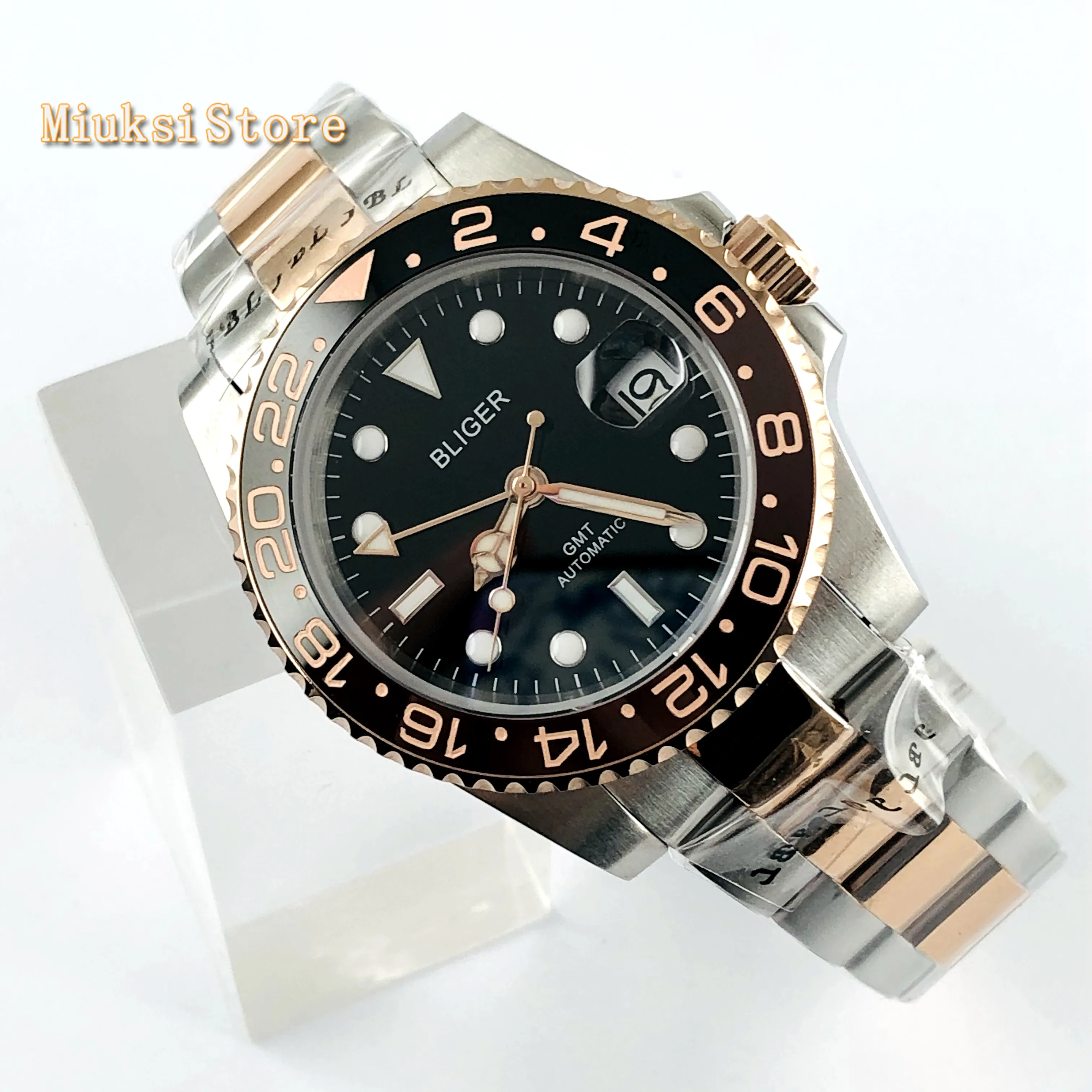 Good Product Bliger 40mm mens top business watch GMT black dial sapphire glass ceramic bezel date window luminou
